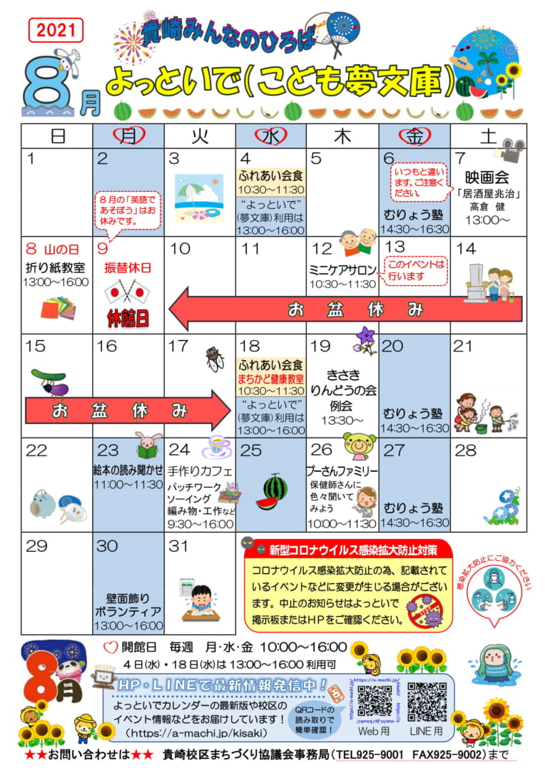 2021年8月のよっといで(こども夢文庫)カレンダーが完成いたしましたのでアップいたします。