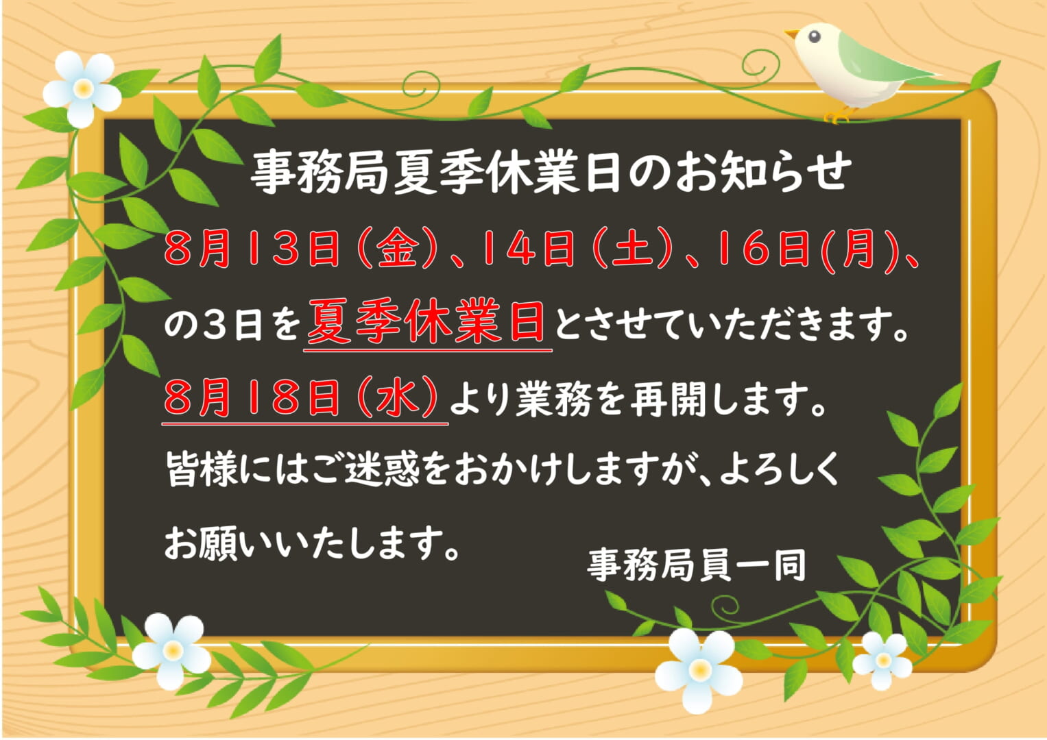 事務局夏季休業日のお知らせ