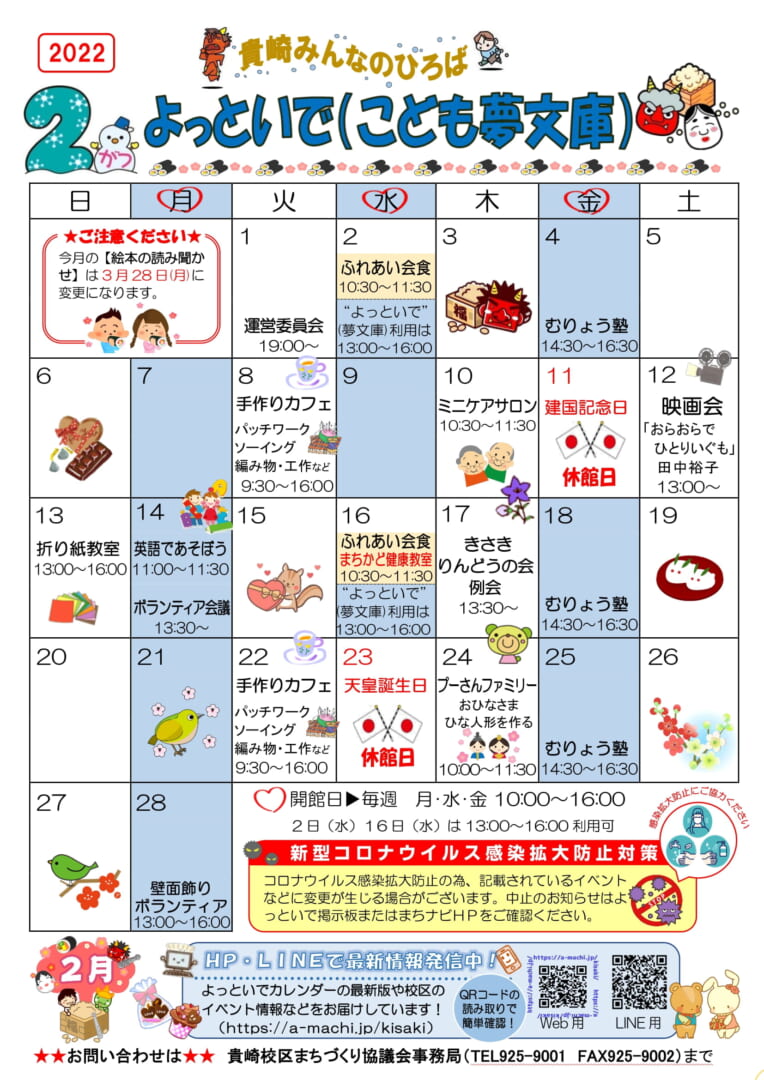 ☆2022年2月開館カレンダー=貴崎みんなの広場”よっといで”☆ 投稿日 2022年1月6日 著者 kisaki カテゴリー 未分類 あけましておめでとうございます。2022年もよろしくお願いいたします。 2022年2月のよっといで(こども夢文庫)カレンダーが完成いたしましたのでアップいたします。カレンダー画像をクリックしていただきますと、PDFデータが開きますので印刷等にご利用ください。 新型コロナウイルスの感染拡大防止のため、記載されていますイベントなどに変更が生じる場合がございます。中止のお知らせは、よっといでの掲示板またはこちらのHPをご確認ください。