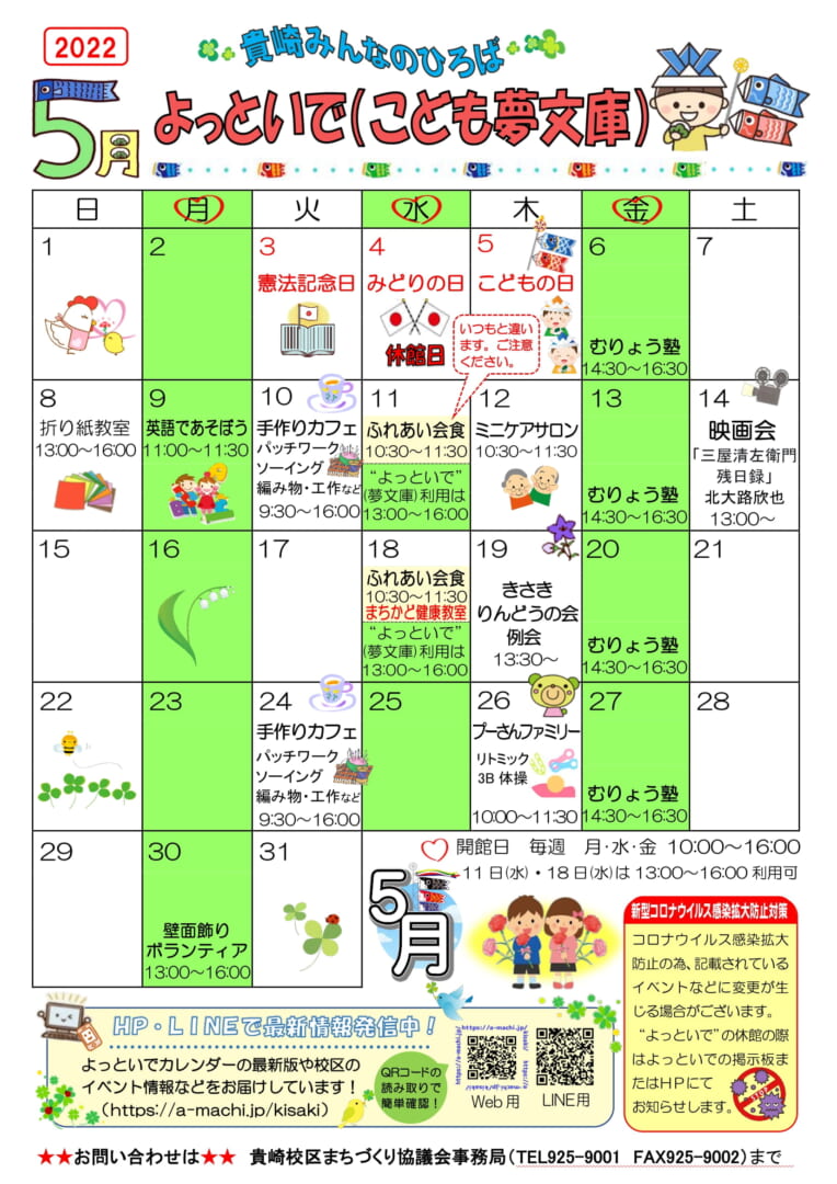 ☆2022年5月開館カレンダー=貴崎みんなの広場”よっといで”☆ 投稿日 2022年4月1日 著者 kisaki カテゴリー 未分類 2022年5月のよっといで(こども夢文庫)カレンダーが完成いたしましたのでアップいたします。カレンダー画像をクリックしていただきますと、PDFデータが開きますので印刷等にご利用ください。 新型コロナウイルスの感染拡大防止のため、記載されていますイベントなどに変更が生じる場合がございます。“よっといで”の休館の際は、よっといでの掲示板またはこちらのHPにてお知らせします。
