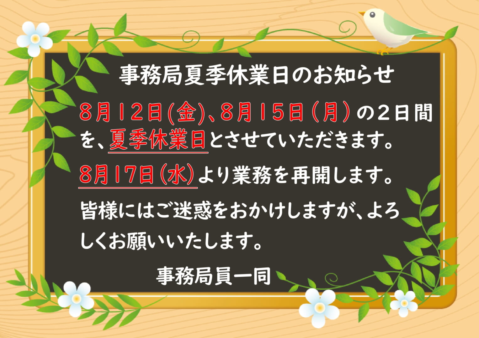 事務局2022年度夏季休業日のお知らせ