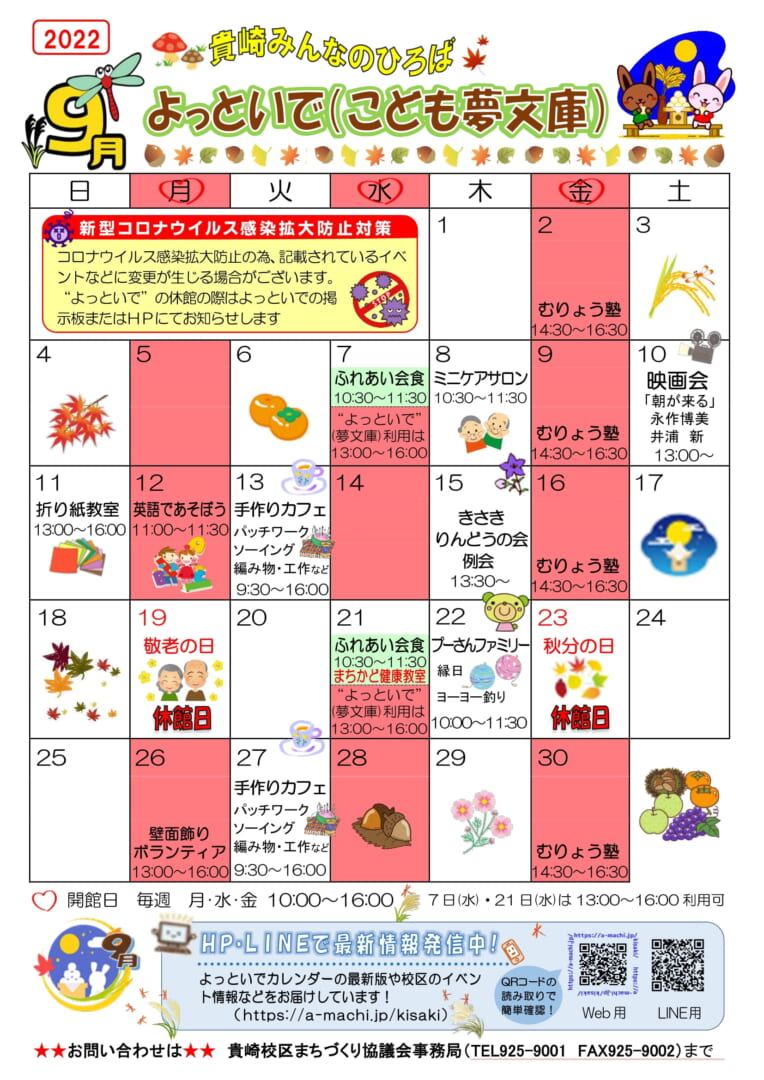 ☆2022年9月開館カレンダー=貴崎みんなの広場”よっといで”☆ 投稿日 2022年8月1日 著者 kisaki カテゴリー 未分類 2022年9月のよっといで(こども夢文庫)カレンダーが完成いたしましたのでアップいたします。カレンダー画像をクリックしていただきますと、PDFデータが開きますので印刷等にご利用ください。 新型コロナウイルスの感染拡大防止のため、記載されていますイベントなどに変更が生じる場合がございます。“よっといで”の休館の際は、よっといでの掲示板またはこちらのHPにてお知らせします。