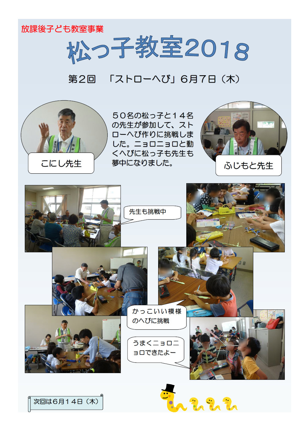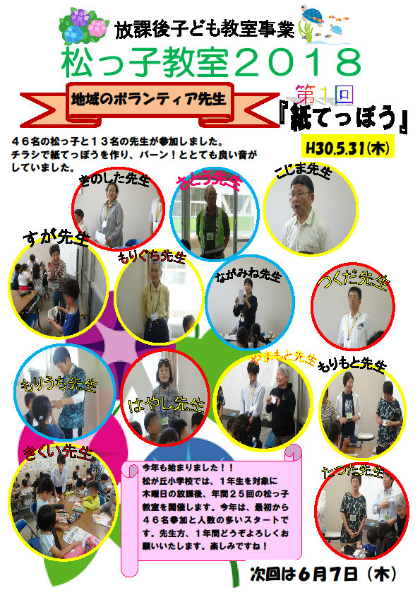 第1回・第2回松っ子教室2018 投稿日 2018年6月13日 著者 matsugaoka カテゴリー 未分類 今年度も松が丘小学校1年生を対象に、毎週木曜日6校時を利用して、地域のボランティア先生たちによる放課後こども教室が開催されています。