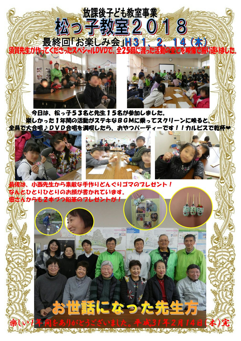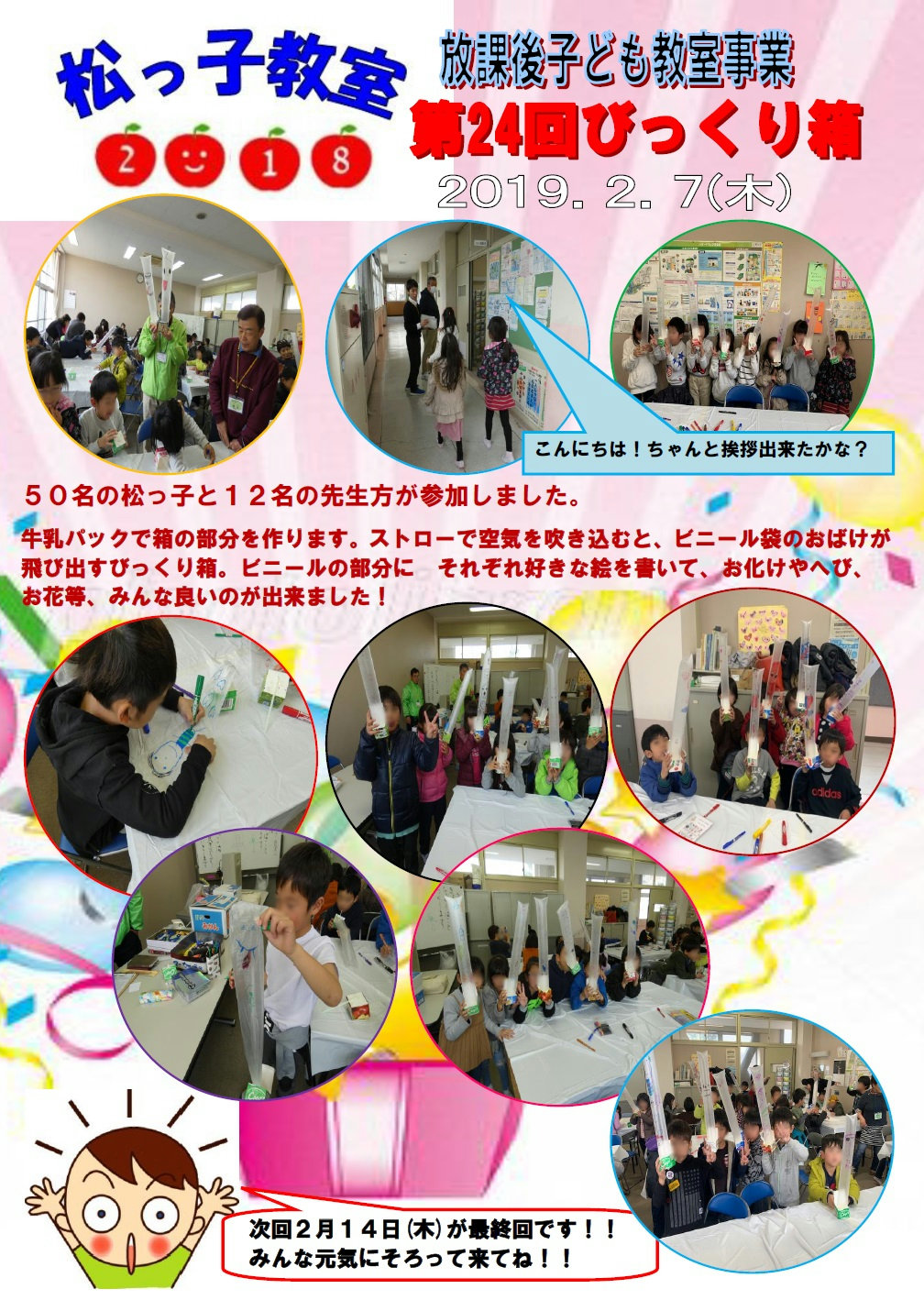 松っ子教室2018 第24回と最終回 投稿日 2019年2月19日 更新日 2019年7月18日 著者 matsugaoka カテゴリー 松っ子教室 2月に行った松っ子教室2018の第24回と最終回の活動内容をご紹介します。【写真の転載禁止】