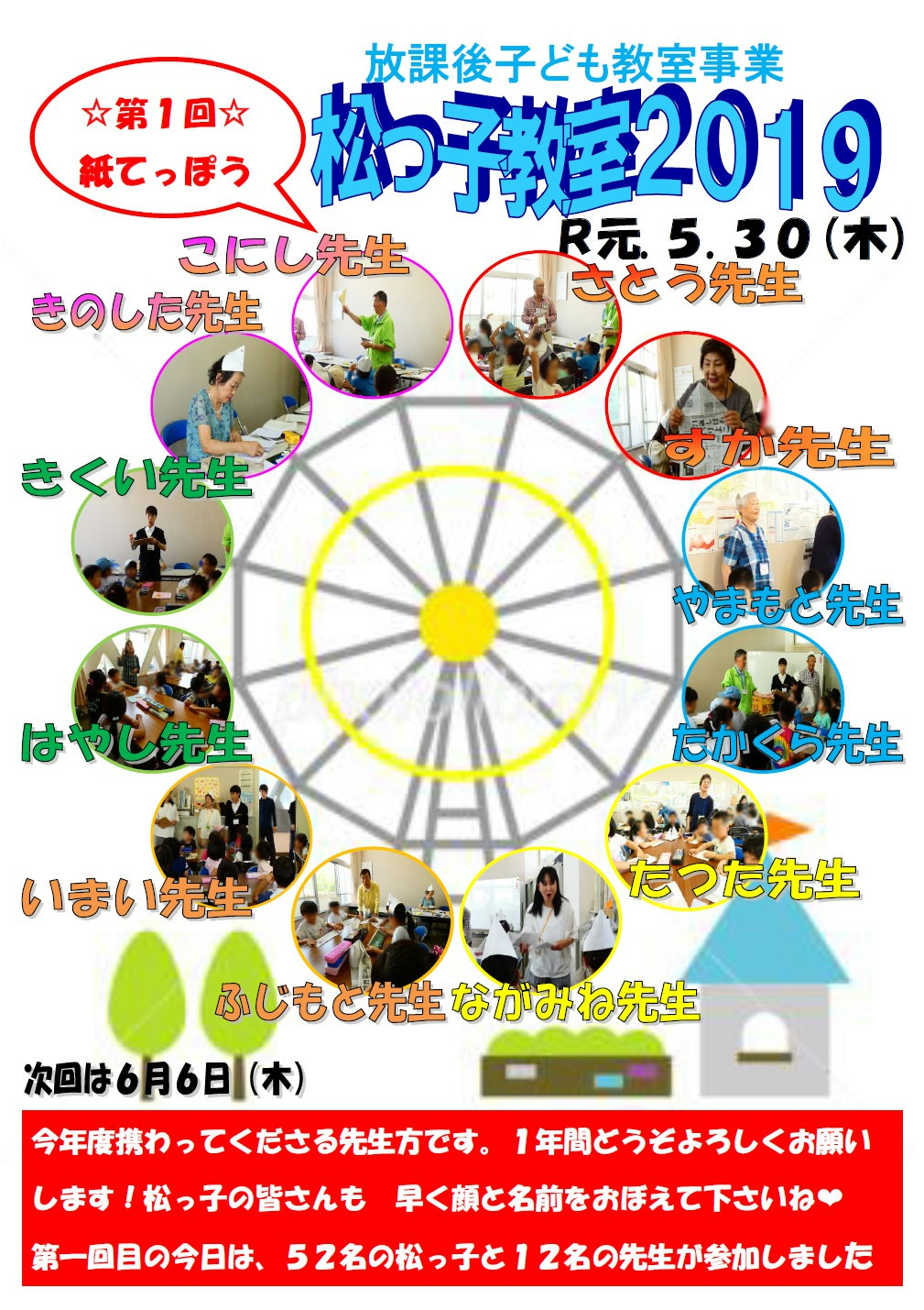 松っ子教室2019第1回 紙てっぽう 投稿日 2019年6月30日 更新日 2019年7月18日 著者 matsugaoka カテゴリー 松っ子教室 今年度も松が丘小学校新1年生を対象に、毎週木曜日の6校時を利用した、地域のボランティア先生たちによる、放課後こども教室が開催されています。