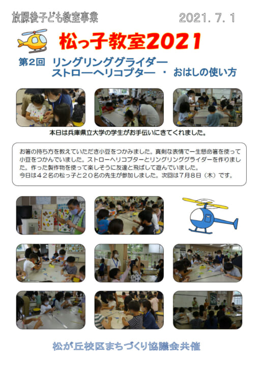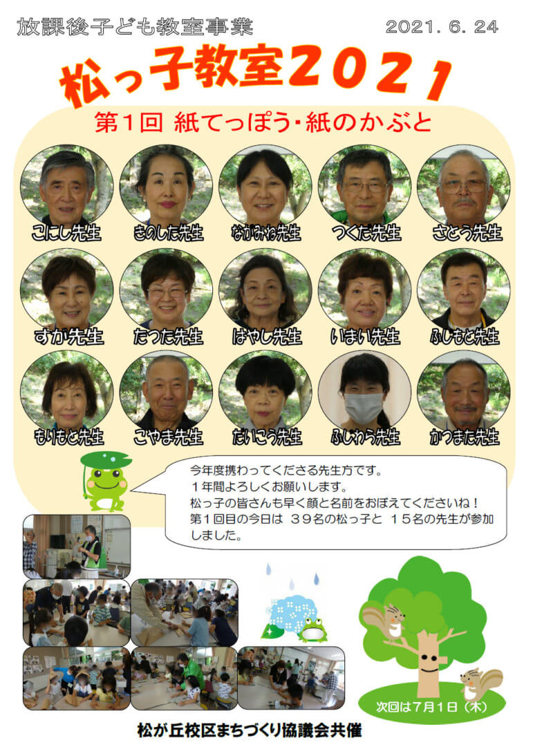 松っ子教室2021 第1回紙てっぽう・紙のかぶと 投稿日 2021年8月27日 更新日 2021年9月9日 著者 matsugaoka カテゴリー 松が丘 カテゴリー 松っ子教室 今年度も、松が丘小学校1年生を対象に、毎週木曜日の6校時を利用した地域のボランティア先生たちによる、放課後子ども教室が開催されています。 【写真の転載禁止】