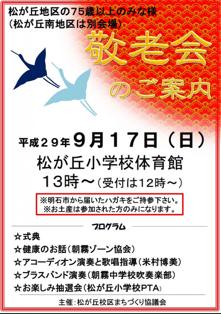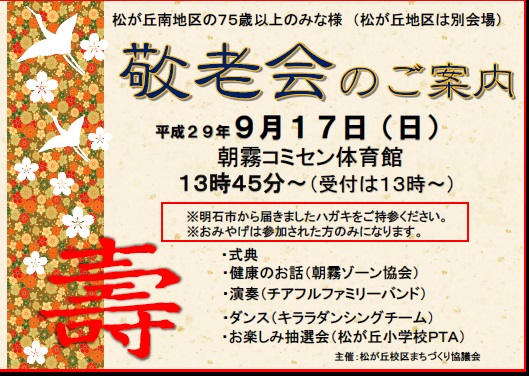 平成29年度敬老会は9月17日(日)に開催されます。