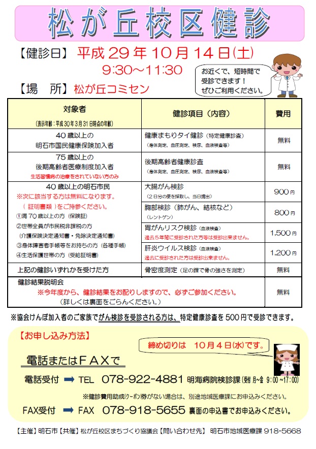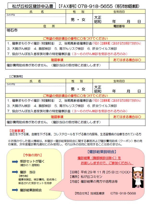 例年、明石市地域医療課が、病院に委託して実施している校区健診。今年度は、会場を松が丘小学校体育館からコミセン会議室に移して開催します。