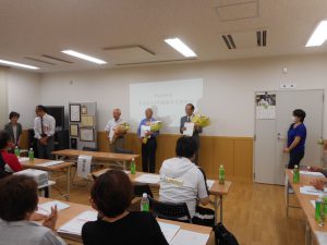 最後に、長年まち協に尽力いただいた岩佐会長を初め功労者に感謝の花束を贈呈しました。