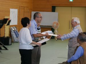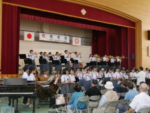 200名弱の敬老者が参加し、鳥羽幼稚園児の遊戯やうた、抽選会、野々池中学吹奏楽部の演奏で楽しんで頂きました。鳥羽小学校の生徒が作った団扇、明南高校調理部作成のクッキーも喜んでくれました。