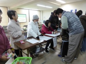 ・9時45分に火災発生との想定で、火災報知器が鳴動、住民の方々は各々のご家庭で、暖房器具の消火、ガスの元栓を閉じ、避難袋を持って玄関を出ました。その時、事前に配布されていた磁石のプレート「避難完了」を玄関に貼り、玄関を施錠しました。そして避難場所として指定された「ふれあいセンター」に集結して、「避難者名簿」に家族を含めて記帳しました。(参加者は120名を超えました)