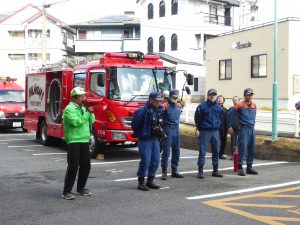 再度、参加者全員が集合し、消火器の使用法を学んだ後、管理組合理事長、及び消防署防災センターの方より挨拶があり、本日の訓練を終了しました。