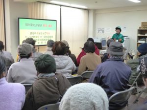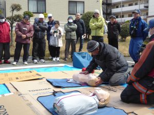 以後、参加者が2グループに分かれて、Aグループは屋外で、救命訓練(心肺蘇生法)=胸骨圧迫やAEDの使用法などを実体験しました。Bグループは、屋内で、映像も含めて「我家でできる防災・減災」の話があり、新聞紙でできるスリッパ・広告チラシで作る紙コップなど実技を学びました。後、AグループとBグループが交代しました。