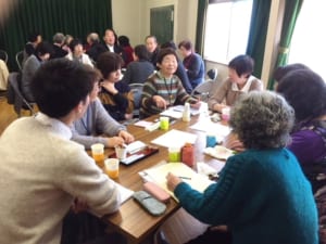 ティータイムをはさんでのサロン(交流会)では、各テーブルごとで自己紹介を行った後、ボランティア活動していく上で抱えている問題点などを話し合いました。