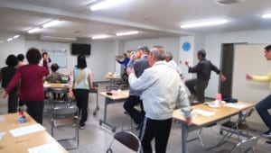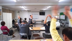 掌から始まり姿勢、簡単な運動へと声も出すのがいいねと、脳トレにもなってる等。
