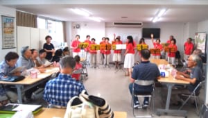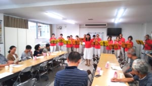 ①虫の声、②赤とんぼ、③荒城の月、④四季の歌、⑤朝はどこから、⑥あざみの歌、⑦明日があるさ、一気に7曲全員で合唱しました。