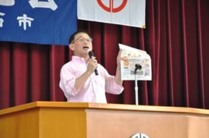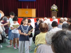 式典は10時から開始。実行委員長、まち協会長の挨拶のあと、明石市長と和坂小学校長から祝辞をいただき、大勢の来賓の方々にも出席いただきました。まち協会長より長寿(傘寿)に該当された7名の方に記念写真が贈呈され、そのあと、参加者全員に和坂小児童から手紙が配られました。丁寧に書かれた心のこもった児童からの手紙に癒されました。