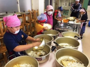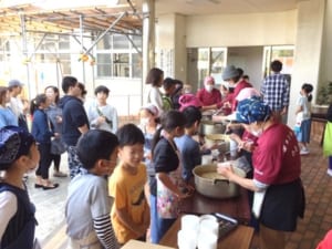 3年生の社会環境体験事業の一環として、6月に地域の畑でイモの苗植えを行い、10月に収穫しました。そのおイモを使ってさつま汁を作り、地域の皆さんに提供しました。