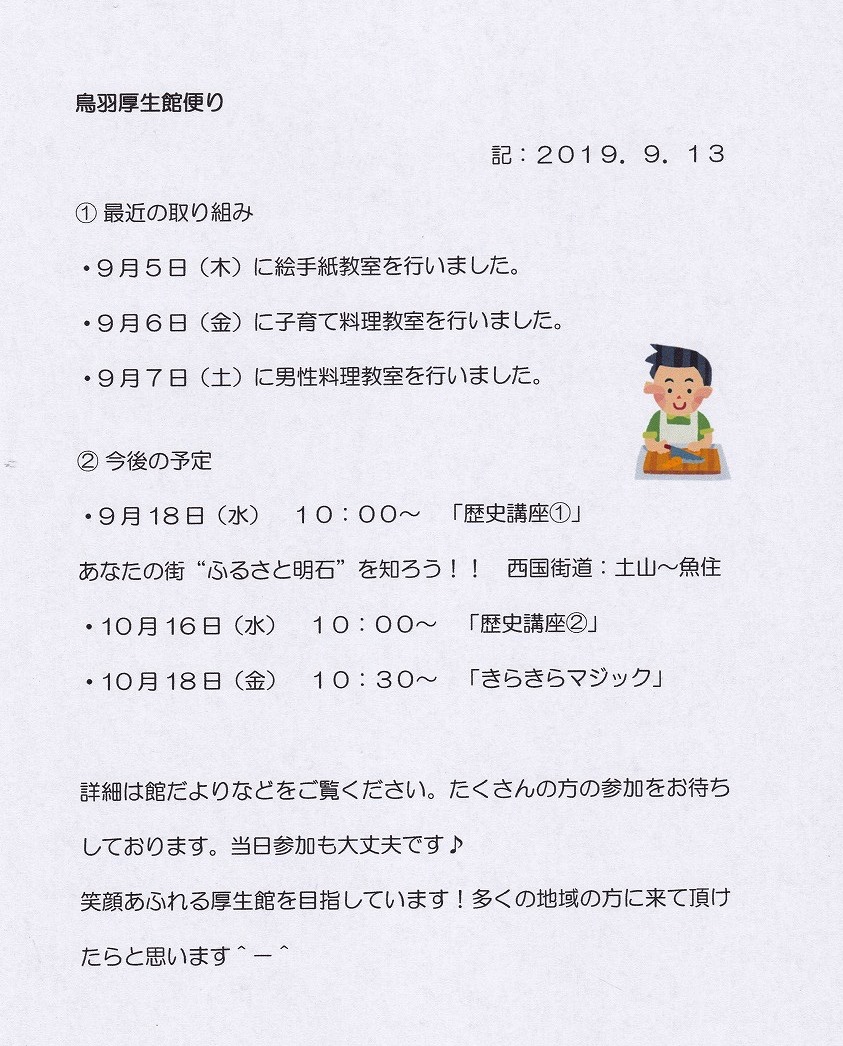 鳥羽厚生館便り 「絵手紙教室」、「子育て料理教室」、「男性料理教室」 投稿日 2019年9月13日 更新日 2019年12月14日 著者 wasaka カテゴリー 和坂 鳥羽厚生館便り 記:2019年9月13日
