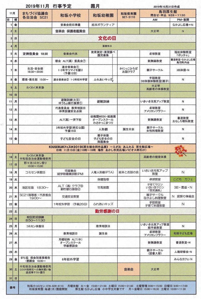 和坂校区まちづくり協議会 関係団体行事日程(11月度) 投稿日 2019年10月31日 更新日 2019年12月14日 著者 wasaka カテゴリー 和坂 和坂校区まちづくり協議会 関係団体の11月度行事日程をお知らせします。