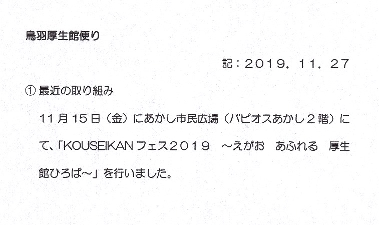 鳥羽厚生館便り 「KOUSEIKANフェス2019 ~えがお あふれる 厚生館ひろば~」