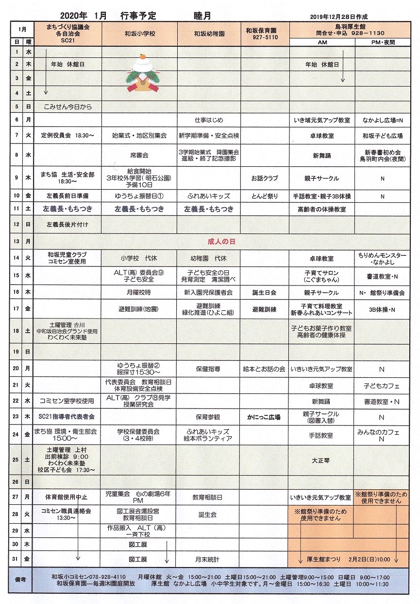 和坂校区まちづくり協議会 関係団体行事日程(1月度)