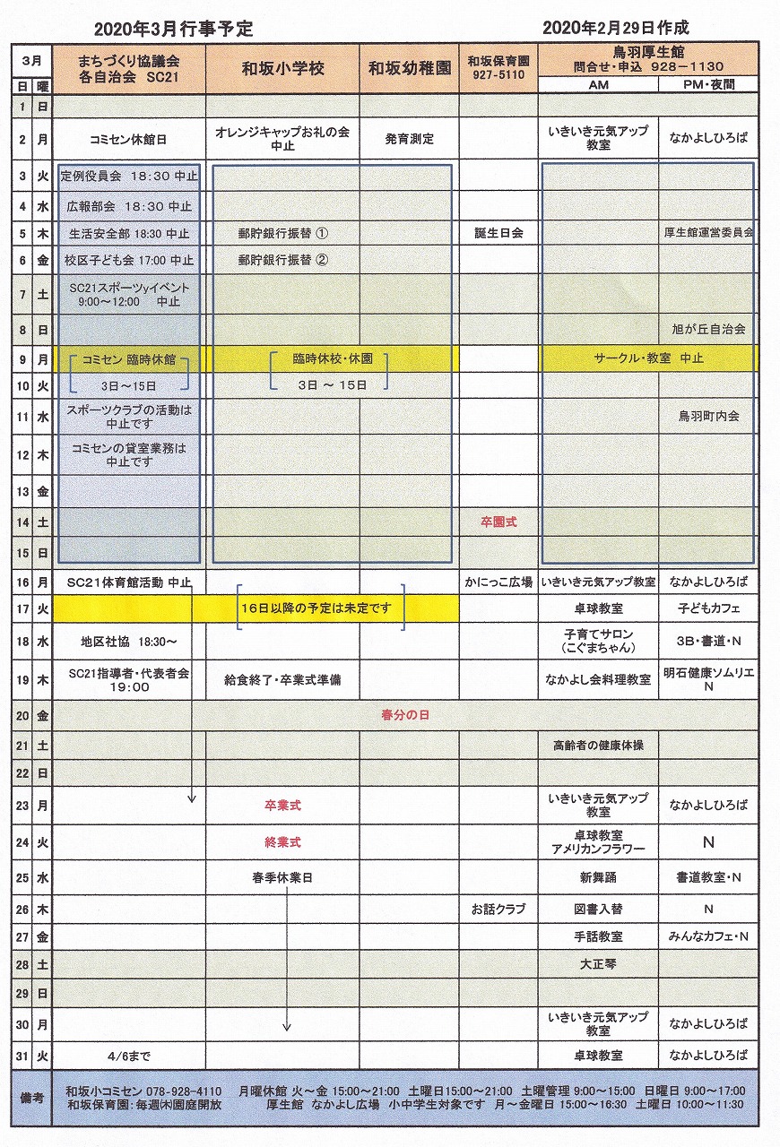 和坂校区まちづくり協議会 関係団体行事日程(3月度) 投稿日 2020年2月29日 更新日 2021年1月13日 著者 wasaka カテゴリー 和坂 注:3月16日以降は、不確定な部分があることを、ご承知おきください。