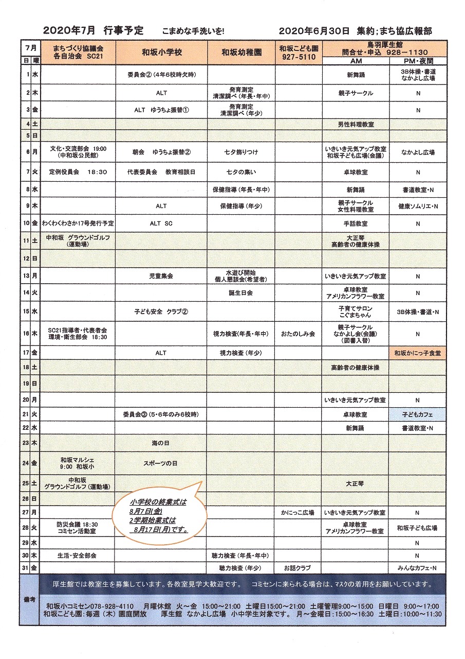 和坂校区まちづくり協議会 関係団体行事日程(7月度)