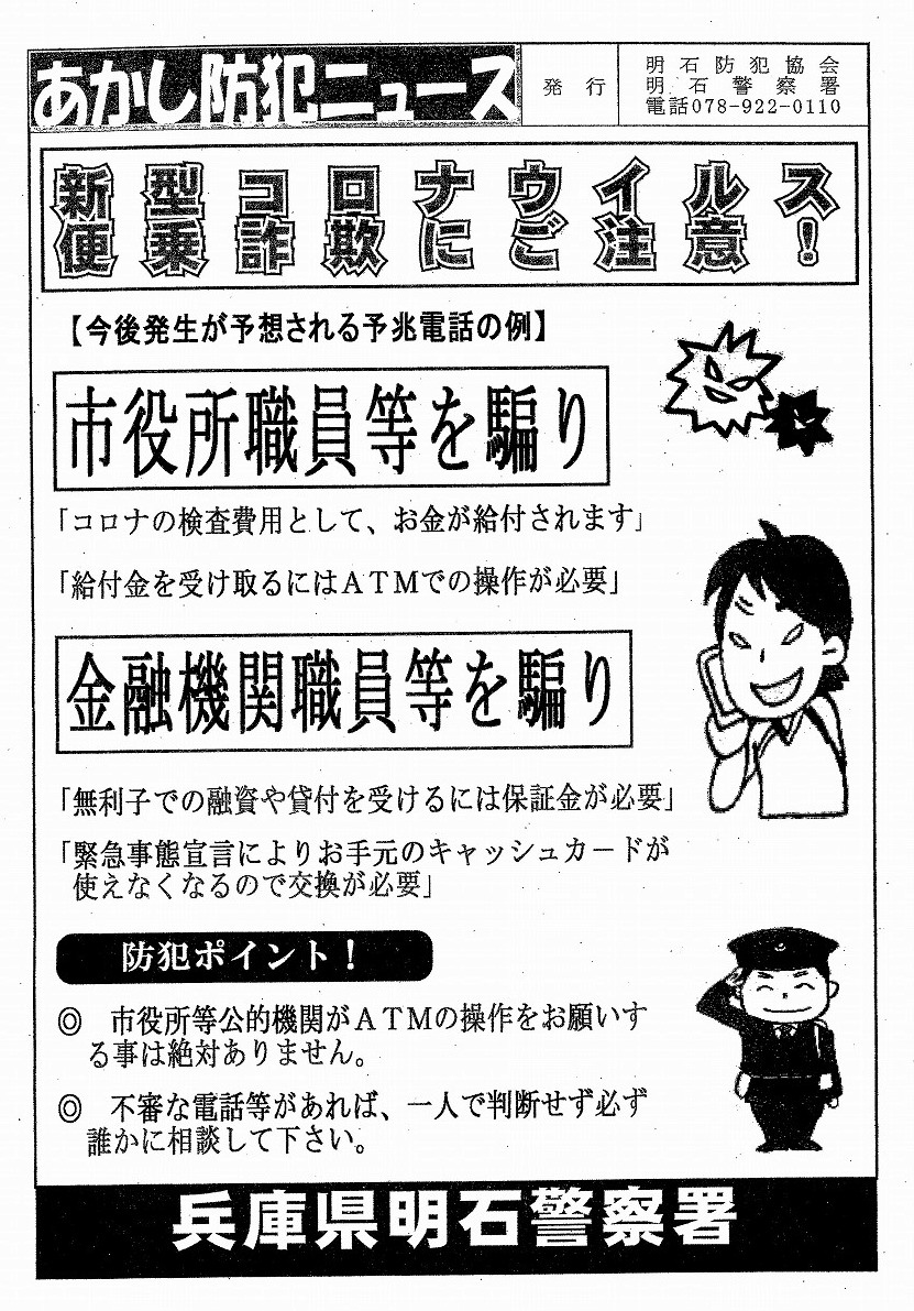 あかし防犯ニュース「新型コロナウィルス便乗詐欺にご注意!」