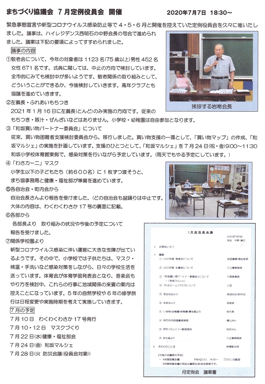 和坂校区まちづくり協議会 7月度 定例役員会 投稿日 2020年7月7日 更新日 2020年7月8日 著者 wasaka カテゴリー 和坂 7月7日に、和坂校区まちづくり協議会 7月度 定例役員会が開催されました。