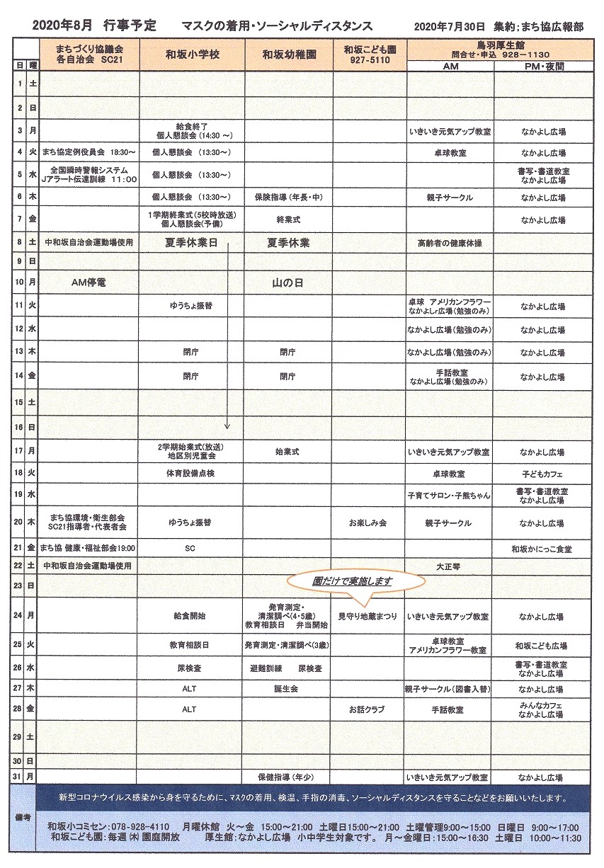 和坂校区まちづくり協議会 関係団体行事日程(8月度)