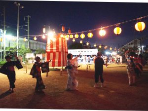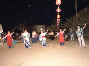 当日は.朝から住民の皆さんでテントの設置やヤグラ・提灯等の飾り付けを行いました。午後5時から子ども会・自治会による夜店がオープンし、午後7時から物故者への黙とうを捧げた後、盆踊りが始まりました。自治会員だけでなく大勢の人に参加してもらい、踊りの輪、人の輪が拡がりました。最後の福引抽選会では、抽選会参加者全員に景品か当たり、景品とともに笑顔を持って帰りました。