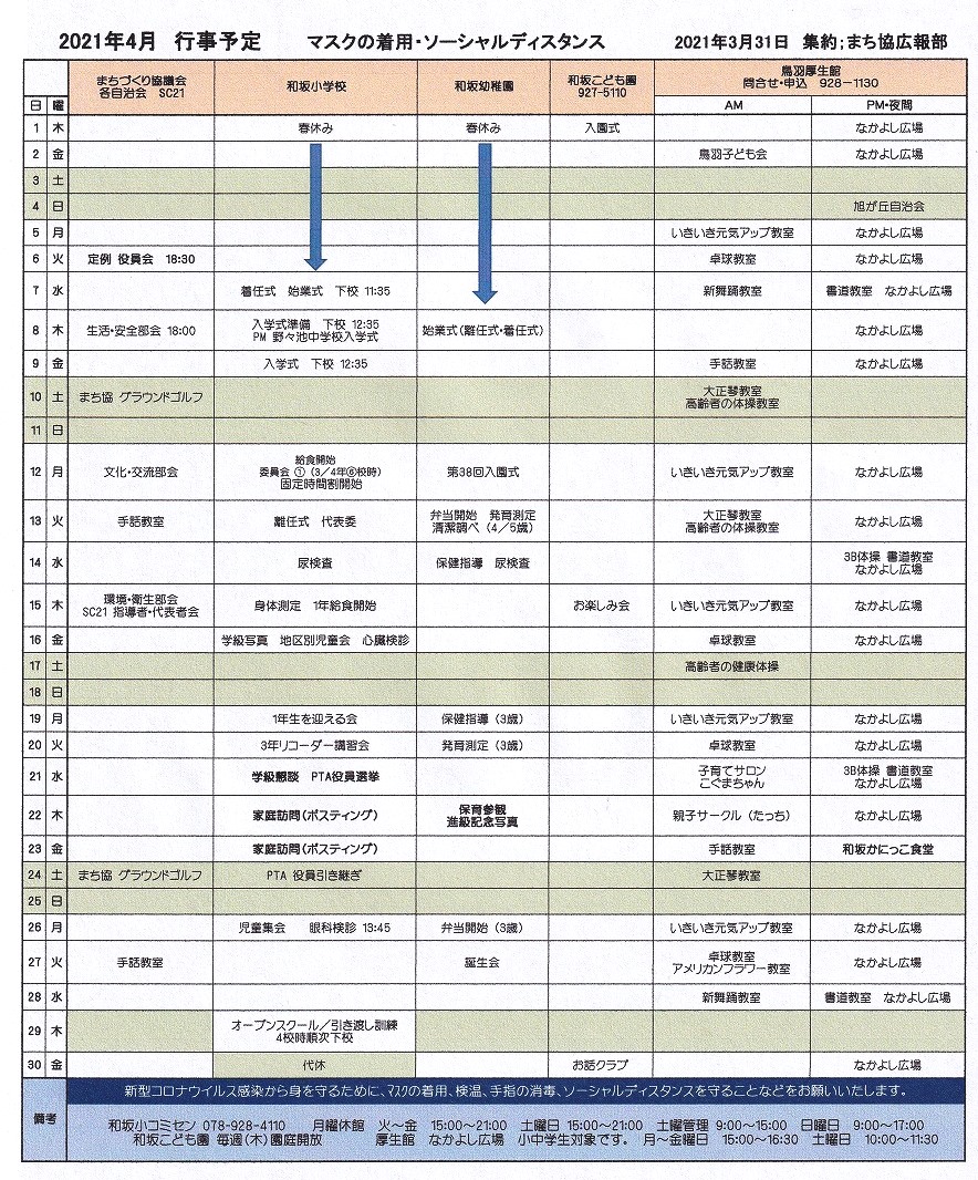 和坂校区まちづくり協議会 関係団体行事日程(2021年4月度)