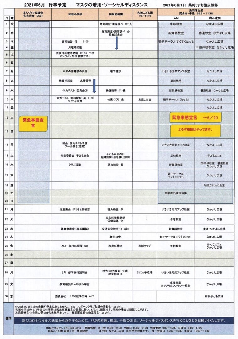 和坂校区まちづくり協議会 関係団体行事日程(2021年6月度)