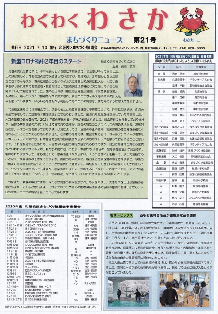 わくわくわさか」第21号が発行されました 投稿日 2021年7月10日 更新日 2021年7月12日 著者 wasaka カテゴリー 和坂 ・和坂校区まちづくり協議会の広報紙「わくわくわさか」まちづくりニュース第21号(発行日:2021年7月10日)が発行されました。 ・校区の皆様方宅へお届けします。