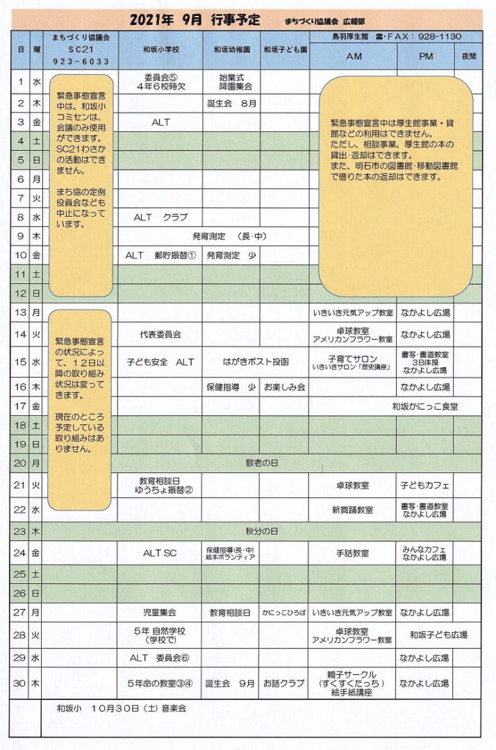 和坂校区まちづくり協議会 関係団体行事日程(2021年9月度)