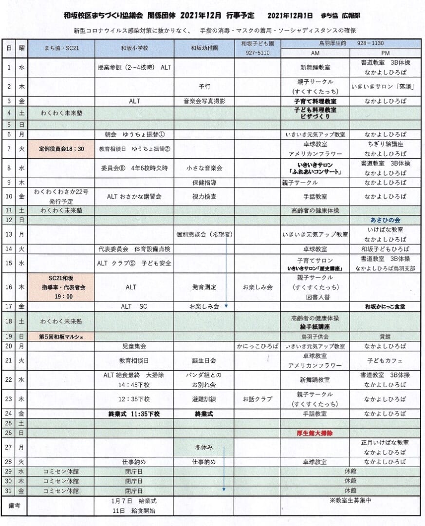 和坂校区まちづくり協議会 関係団体行事日程(2021年12月度)