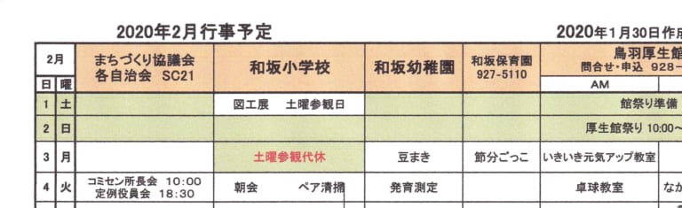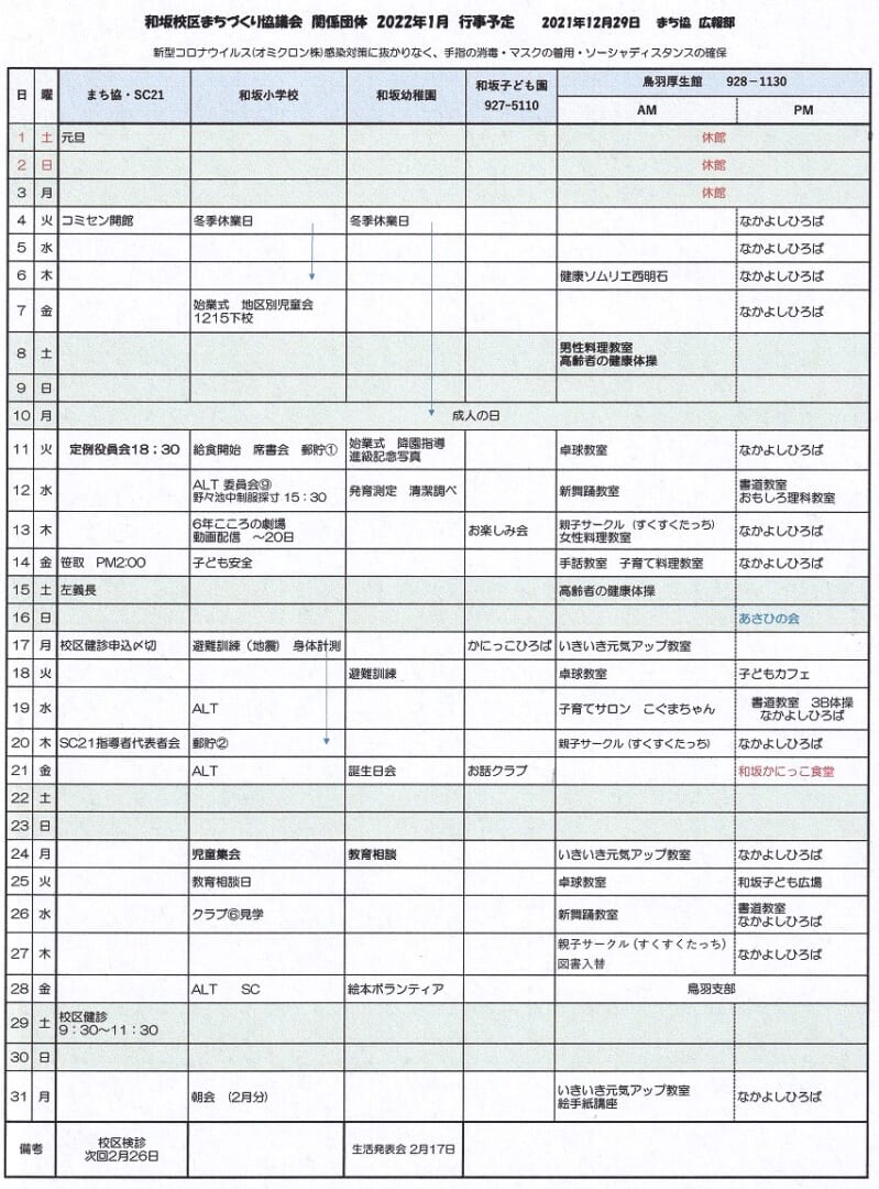和坂校区まちづくり協議会 関係団体行事日程(2022年1月度)