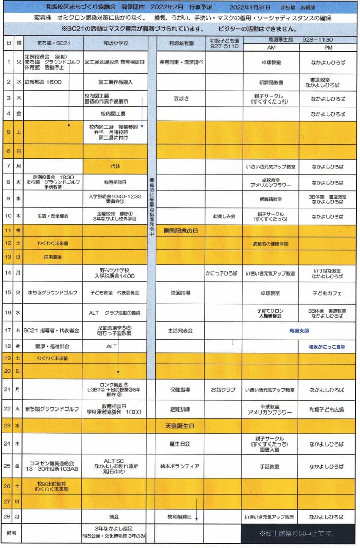 和坂校区まちづくり協議会 関係団体行事日程(2022年2月度)