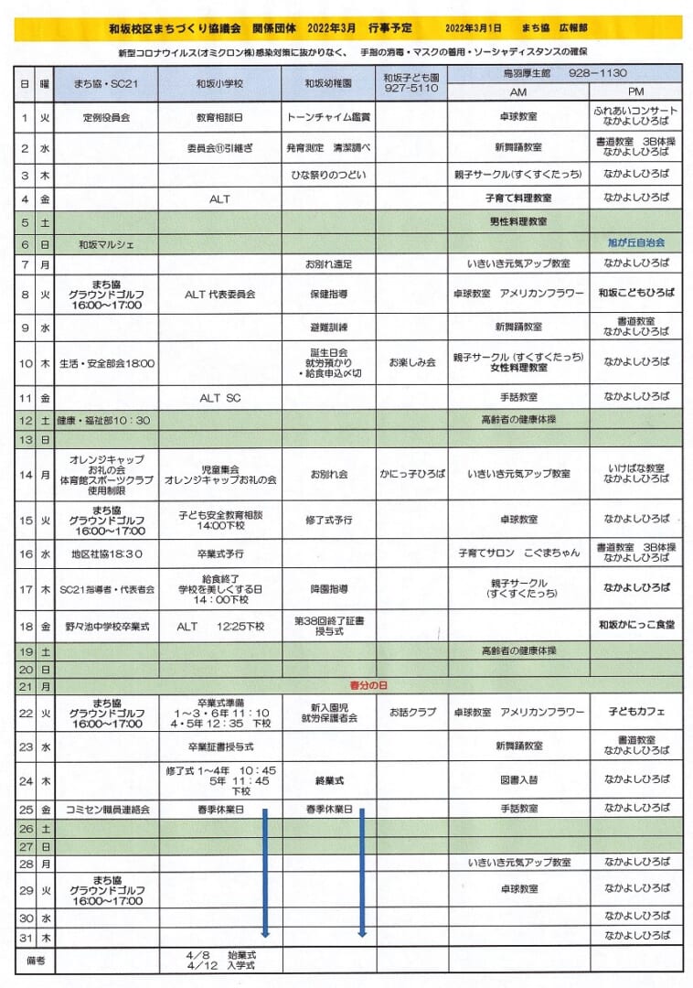 和坂校区まちづくり協議会 関係団体行事日程(2022年3月度)