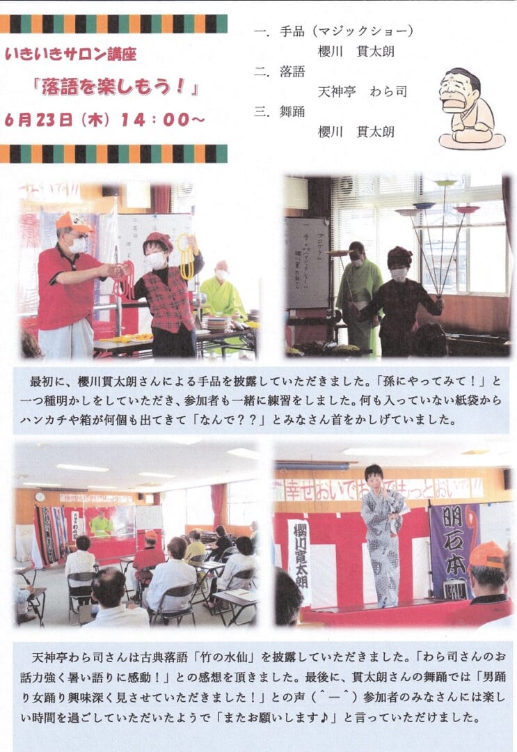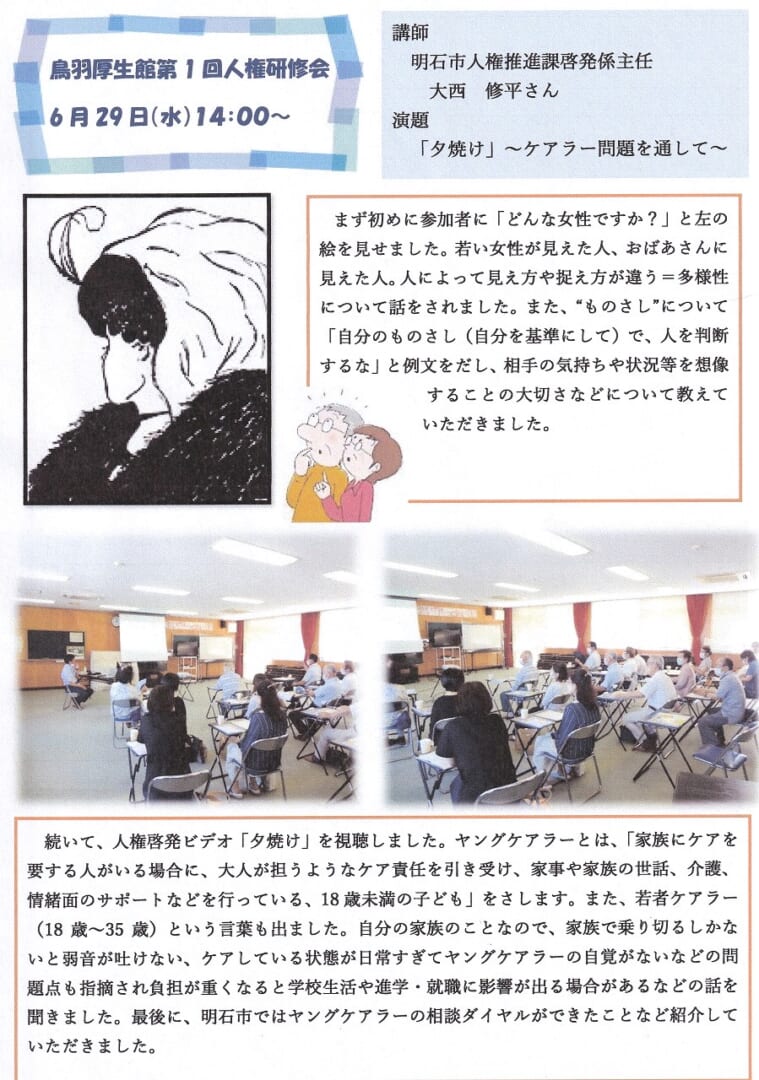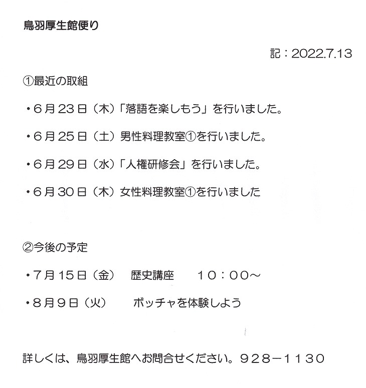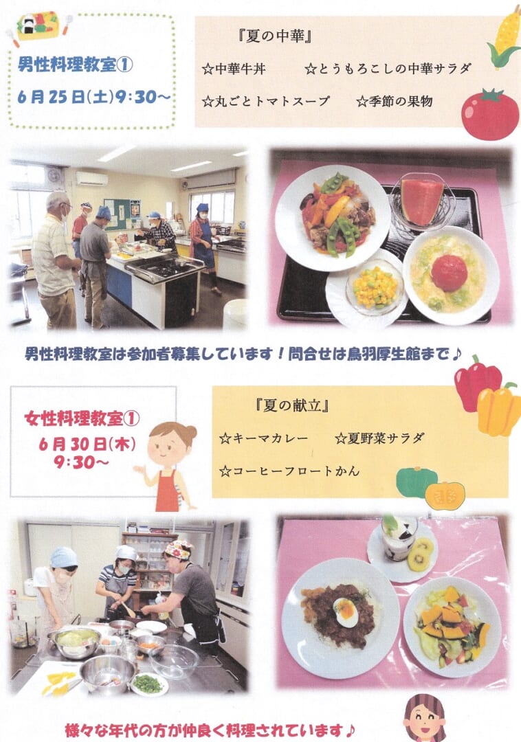 鳥羽厚生館便り 「落語を楽しもう」、「男性料理教室」、「女性料理教室」、「人権研修会」