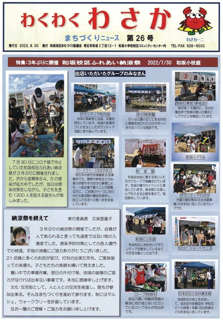 「わくわくわさか」第26号が発行されました 投稿日 2022年8月24日 著者 wasaka カテゴリー 和坂 和坂校区まちづくり協議会の広報紙「わくわくわさか まちづくりニュース第26号(発行日:2022年8月30日)」が発行されました。 ・校区の皆様方宅へお届けします。 なお、当26号は、A4サイズ(1枚)で両面印刷となっています。