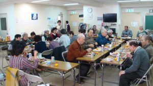 乾杯のあと、多彩な食材の弁当に舌鼓をうちながら、皆で会話を楽しみました。昨年の思い出話や、今年の高年クラブのイベント計画への注文も出たりして…。