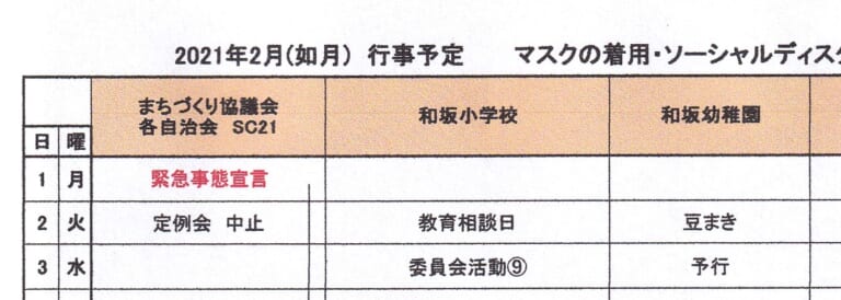和坂校区まちづくり協議会 関係団体行事日程(2021年2月度)