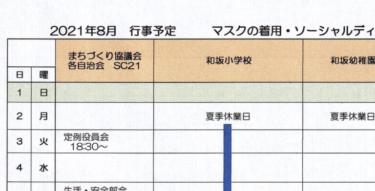 和坂校区まちづくり協議会 関係団体行事日程(2021年8月度)