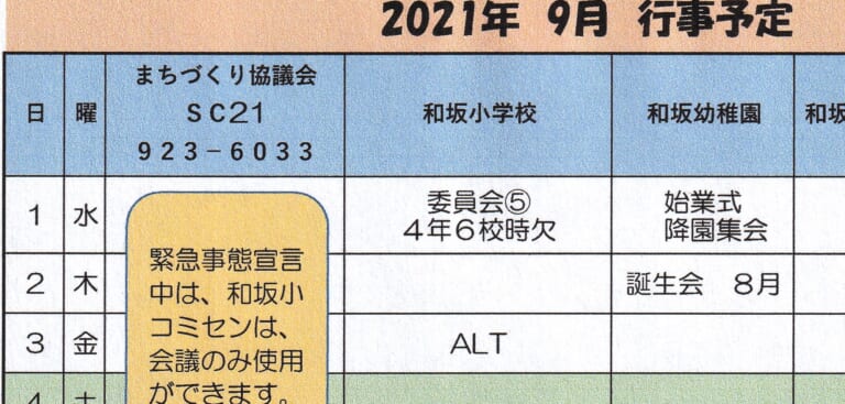 和坂校区まちづくり協議会 関係団体行事日程(2021年9月度)