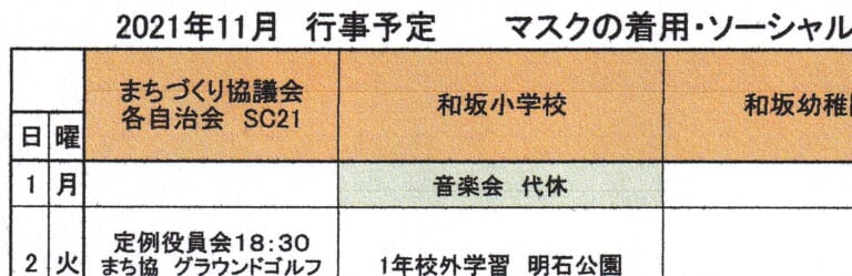 和坂校区まちづくり協議会 関係団体行事日程(2021年11月度)