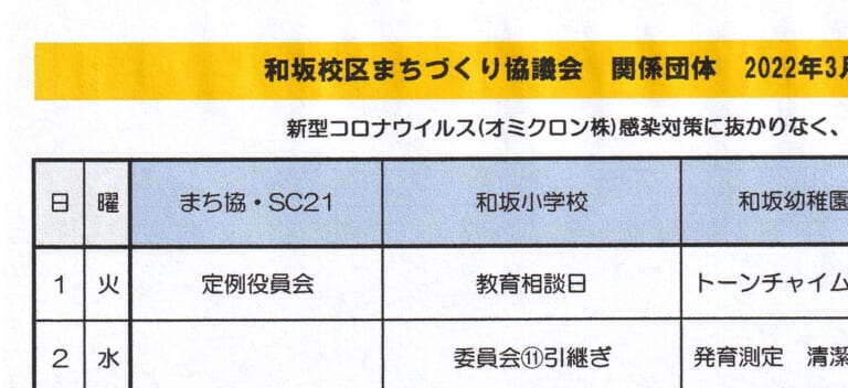 和坂校区まちづくり協議会 関係団体行事日程(2022年3月度)